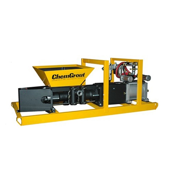 The ChemGrout model CG-550P is a skid mounted, air powered grout machine. This system is designed to provide a continuous operation of mixing and pumping. This unit features a 34 gallon (129 liter) mixing tank and the field proven CG-050 grout pump. The mixer is equipped with baffles, bag breakers and variable speed high-efficiency paddles that provide a rapid mixing cycle. The tank outlet valves are large slide gates that allow the thickest materials to fall easily into the pump hopper. The holding hopper is connected directly to the suction of the grout pump to provide a continuous pumping operation. The grout pump is a 2″ positive displacement, pulsating piston. The rugged steel frame stands up to the toughest conditions on the job site. Operator controls are centrally located for efficient production. The pumping components disassemble without any tools for a fast and efficient cleaning. All components are easily accessible for operating, cleaning and maintenance. The pump comes complete and ready to use with a 12.5 foot grout hose and a set of spare piston cups.